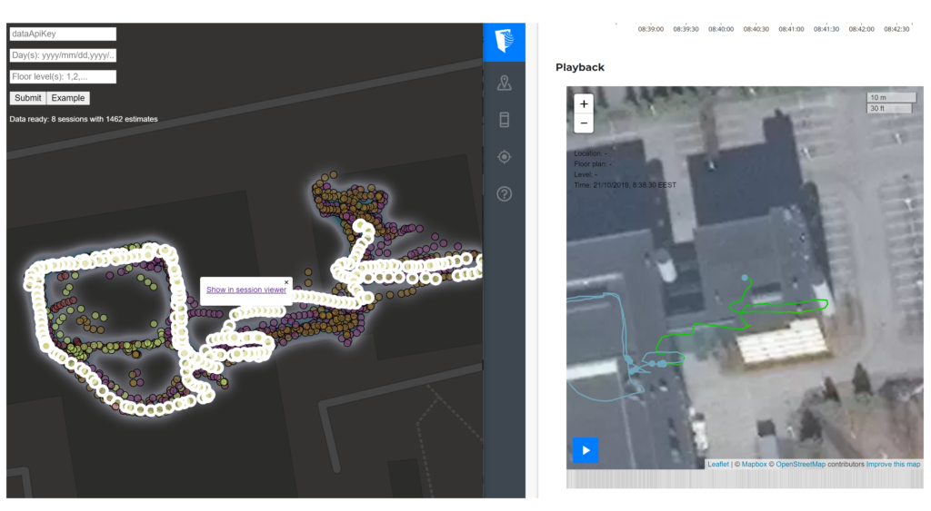 The screenshot below demonstrates how the IndoorAtlas Heatmap lets you load and visualize sessions. Furthermore, you can identify a test walk based on a description of the staff at the field and analyse it in detail with IndoorAtlas Session Viewer.