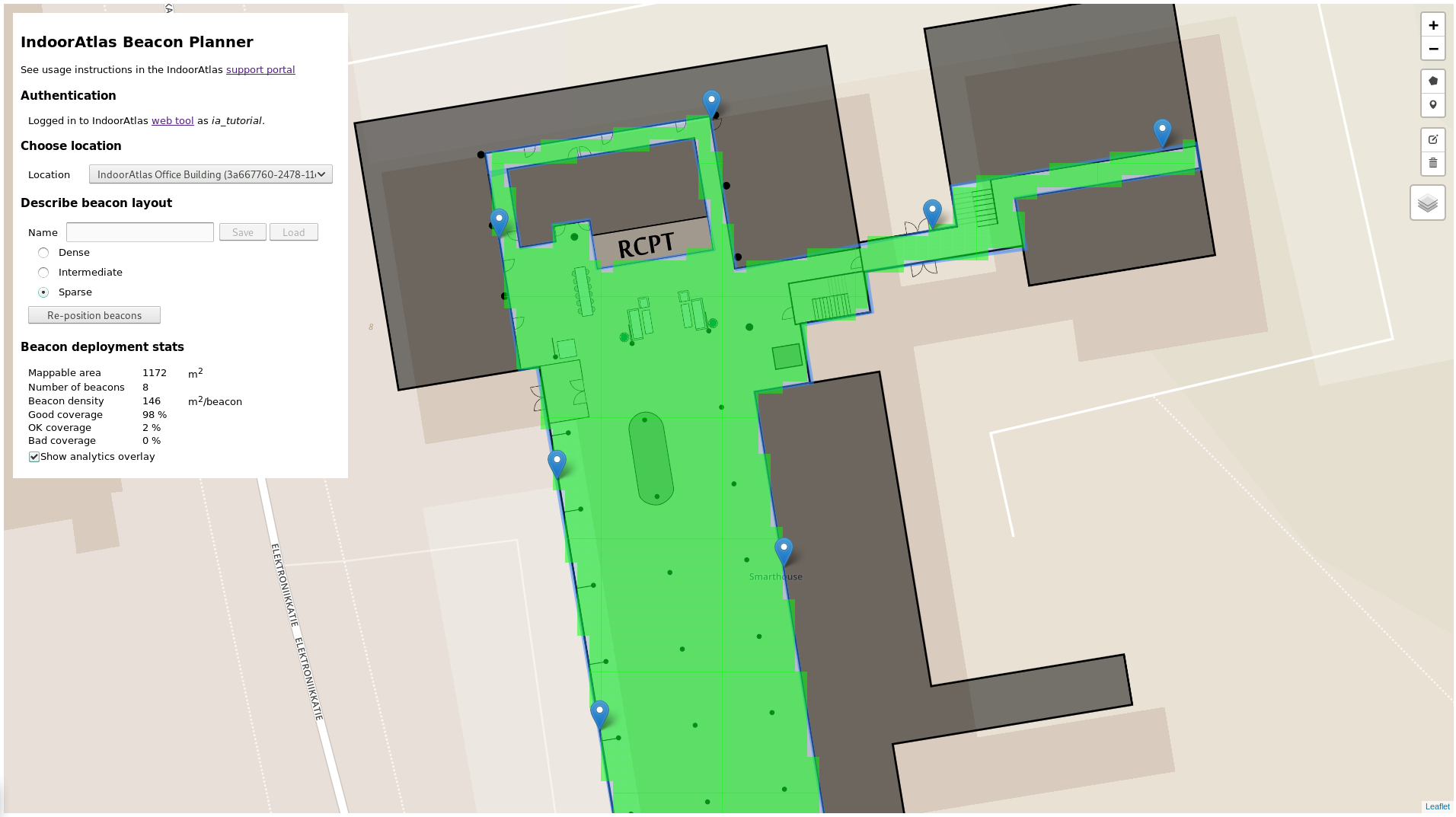 We’re pleased to announce the launch of a new tool to supplement the IndoorAtlas mapping workflow, the IndoorAtlas Beacon Planner. This tool helps you estimate the number of beacons required for decent coverage in your location, and suggests a beacon placement for you, so you will be well equipped when going on site to collect mapping data with IndoorAtlas MapCreator. All you have to do is outline the area to be mapped with the provided intuitive drawing controls.