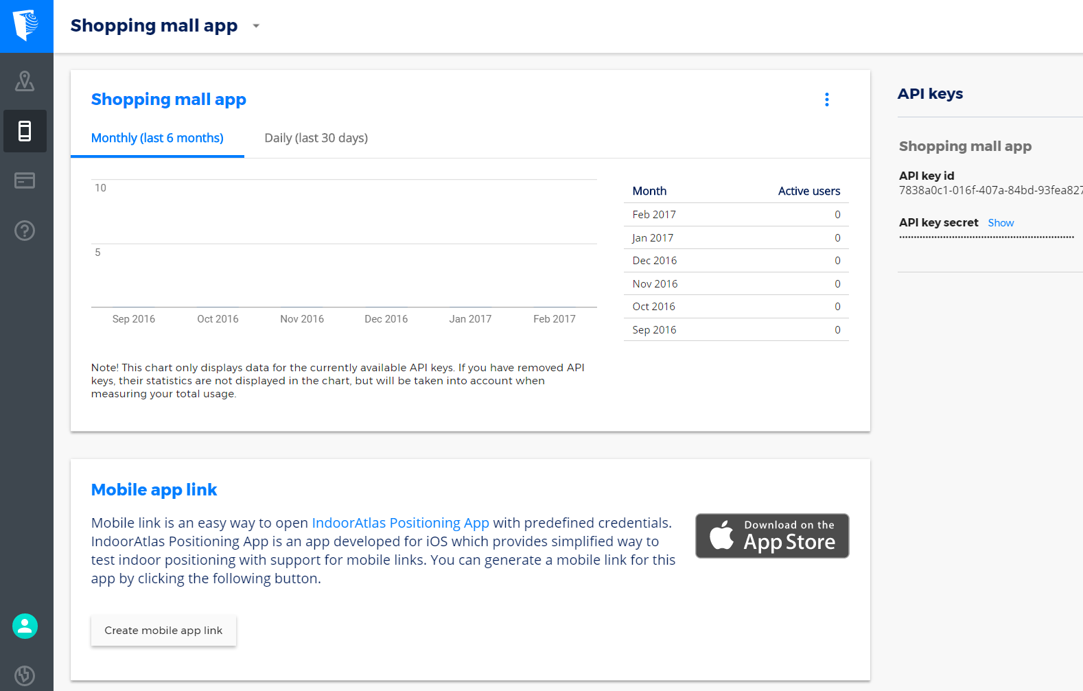 Login at app.indooratlas.com with the IndoorAtlas credentials that were used for mapping the venue. Go to My Apps, open an existing application or create a new one from the top right menu. Inside the application, choose “Create Mobile App link”.