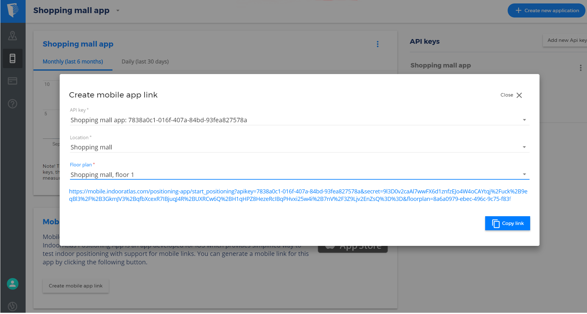 Choose from the dropdown menus the API-key, location, and the floor plan. By opening the created link you can start a positioning session in the corresponding floor plan with any iOS device that has the Positioning App installed.