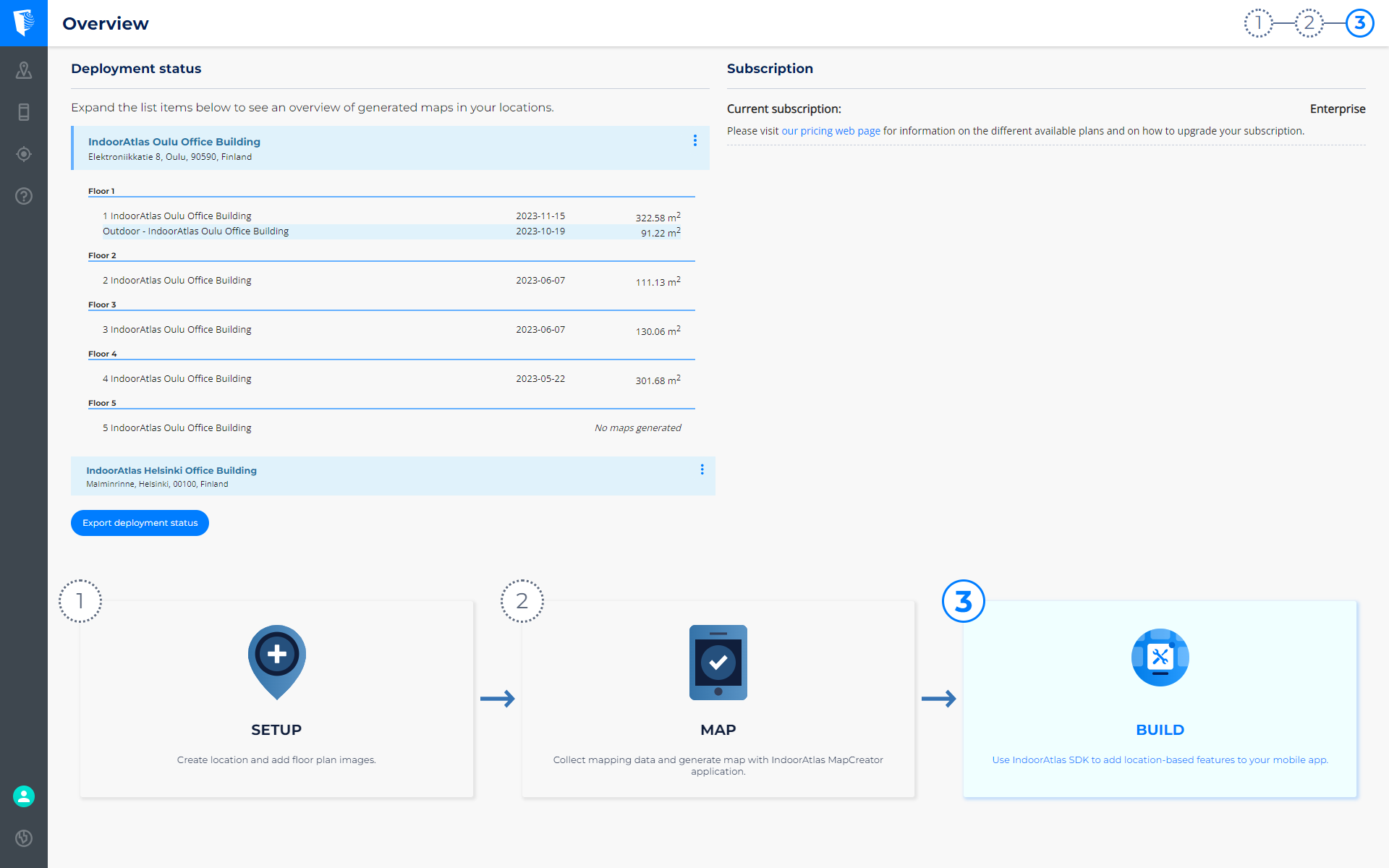 IndoorAtlas Web App now features a new capability that provides users with an overview of all their deployments. This feature offers detailed insights into the mapped areas of each building and floor, allowing users to better manage their deployments. Additionally, users can export this overview as a CSV file, enabling further analysis and integration with other systems.