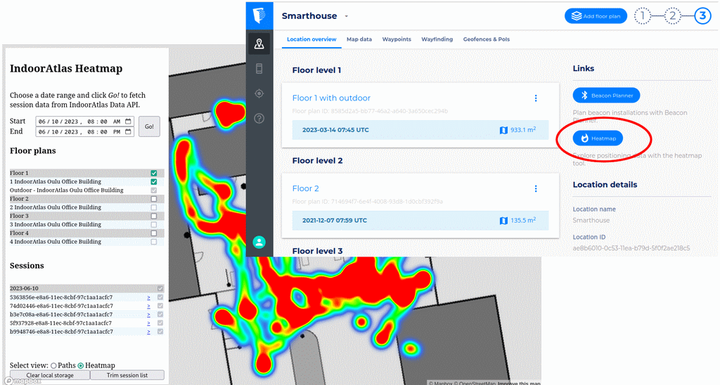 Built on top of the IndoorAtlas Data REST API, our heatmap tool serves multiple crucial functions. It addresses the foundational question in location analytics: “Where and to what extent?” Additionally, it serves as an entry point for conducting more comprehensive analyses of indoor positioning performance by providing links to the IndoorAtlas Session Viewer tool.