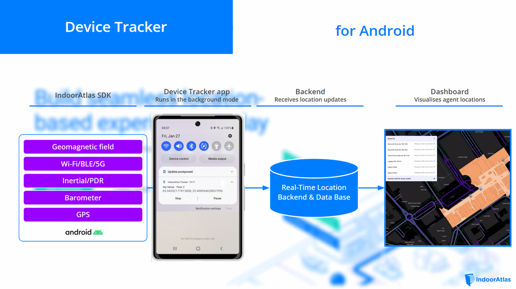 Our Android solution supports all devices, includes the IndoorAtlas Tracker app source code for easy integration, and utilizes IndoorAtlas SDK’s sensor fusion capabilities with a visualizing dashboard