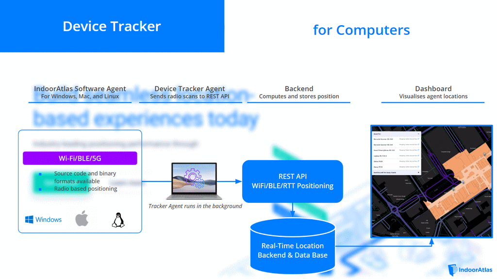 IndoorAtlas Device tracking is offered as a fully tailorable solution, varying from a fully managed pilot from IndoorAtlas, to both customized client and backend from you. We grant you access to our client example source code for both Android and Windows client agents.