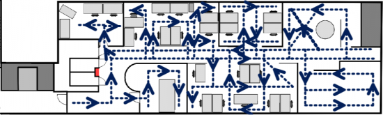 Covering straight corridors is easy, but when corridors start to bend or they open into an oval shaped lobby, things get more challenging. This is where floor plan details are starting to pay off. As said earlier, you need to draw paths accurately, which is easy in corridors as you can draw paths along walls. In asymmetric environment you need the details/reference points in your map to be able to tell where your start and end points are in MapCreator 1.5 and in the physical environment.