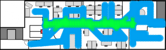 You may also see small spots of yellow or orange in areas where several paths converge or cross each other. These are usually the result of small errors in the start-end markings of the mapping paths, uneven walking speed, or a sign of incorrect placement of your mapping landmarks on the floorplan making it difficult to cover areas precisely. Overcoming these challenges will be discussed in more detail in an upcoming blog post “Mapping bigger areas”.