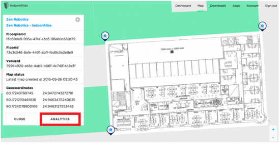 Separate report for each mapped floorplan can be found from the IndoorAtlas Maps at our website. Go to Map, your building, floor and floorplan and click the button “ANALYTICS” on bottom right corner of the dialog box.