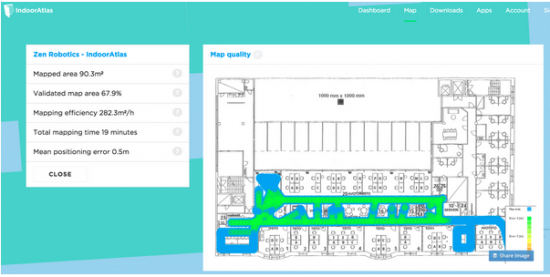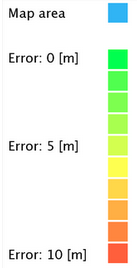 - Green, yellow and red areas indicate the positioning performance along test paths (according to the chart below, the error means difference between the test path you draw and the position estimation from IndoorAtlas cloud server)